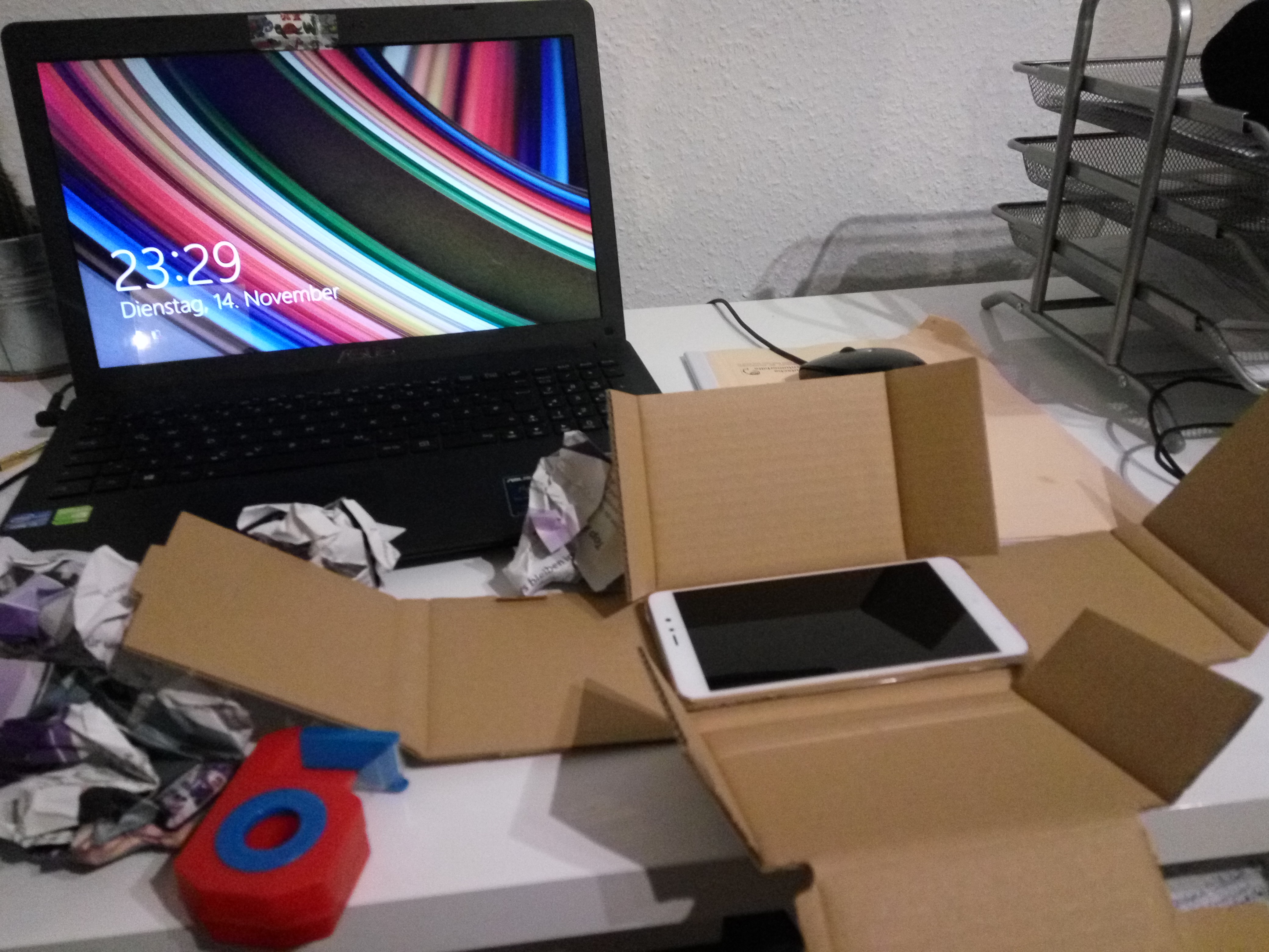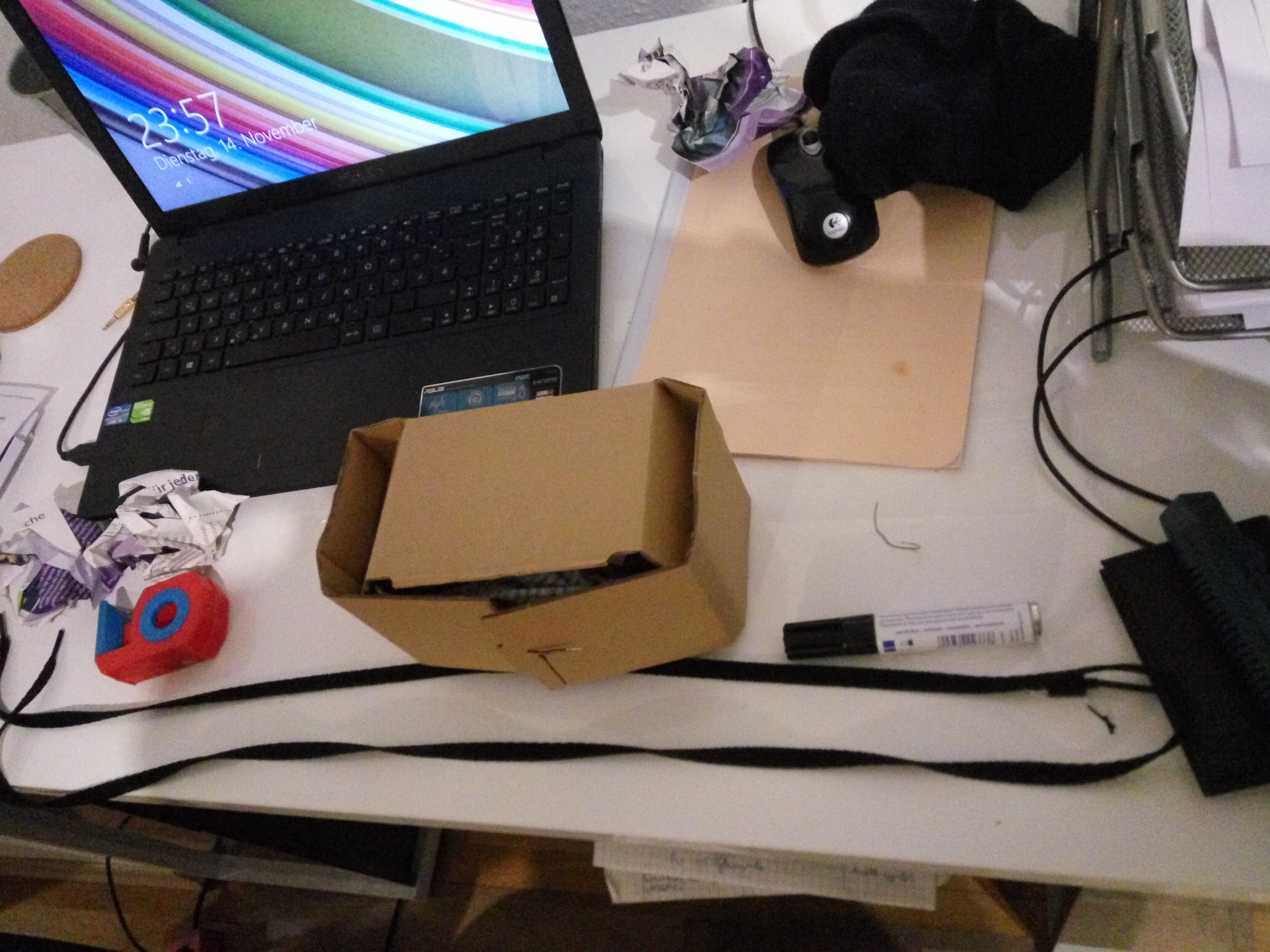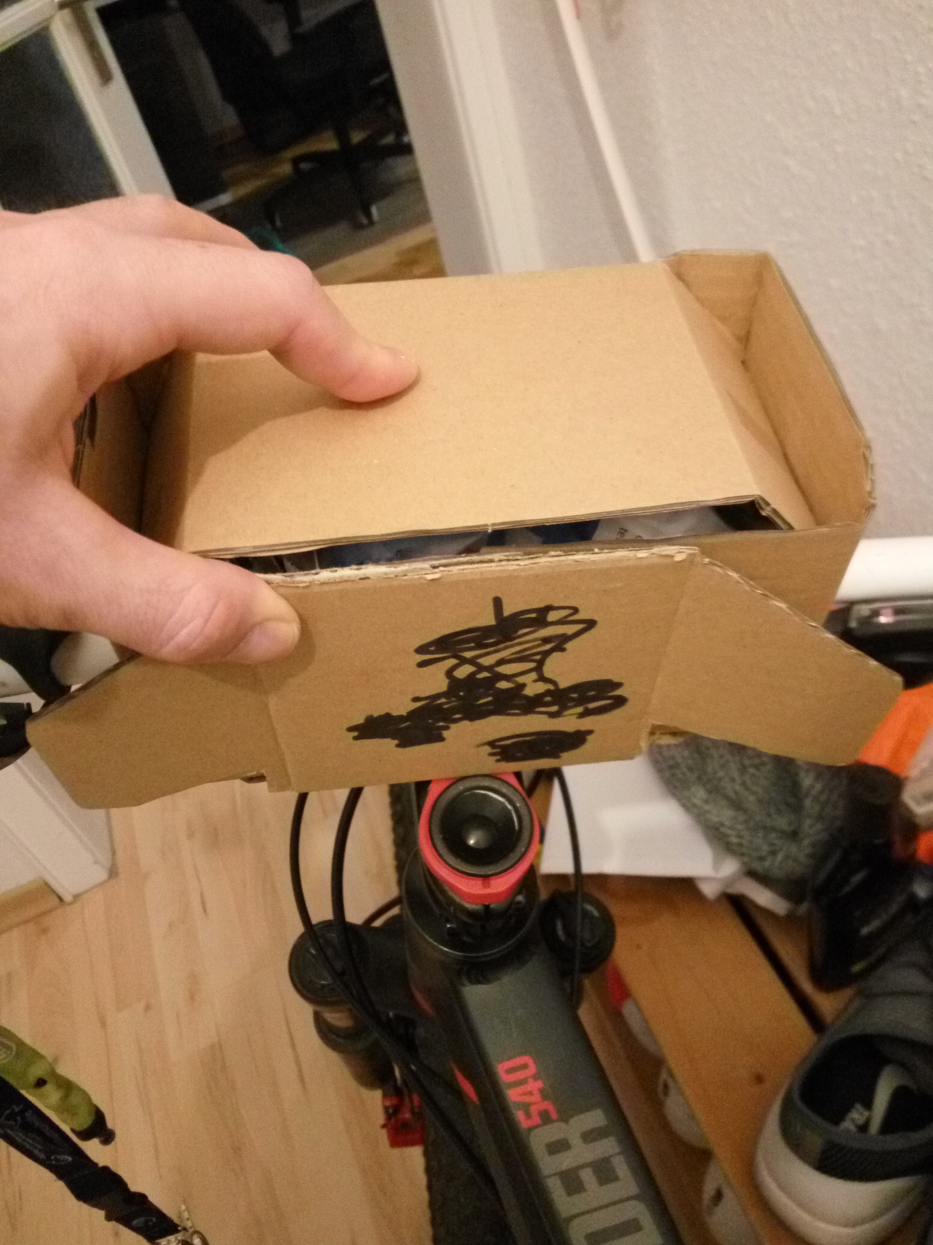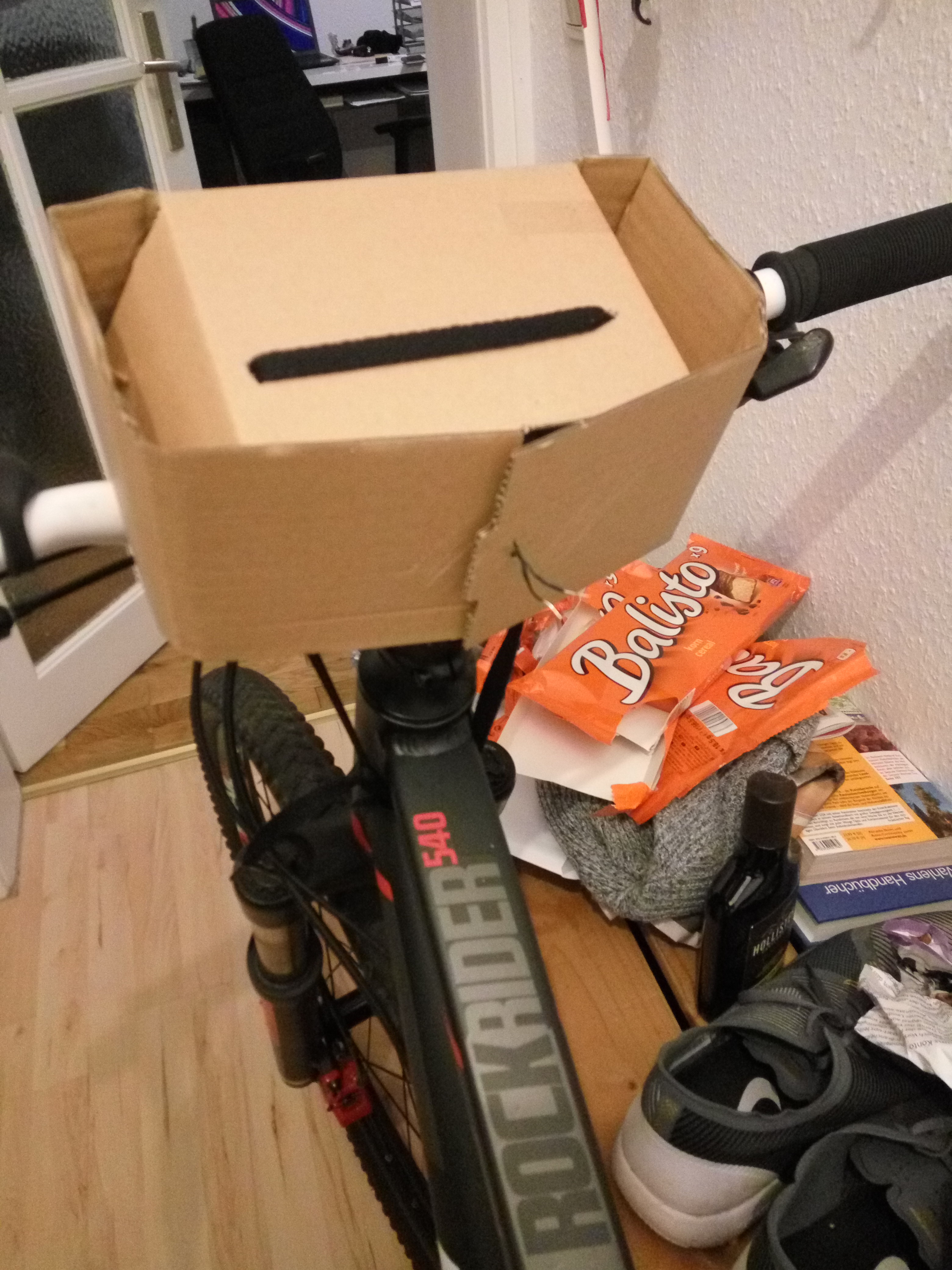 Wenn man schon mal das Fahrrad in der Hand hatte …. warum nicht einfach noch ein Ründchen um den Block strampeln – macht müde, irgendwann. ;D Beim Schokoriegel inhalieren kam mir noch die super Idee mir doch eine Halterung für’s Handy zu basteln, damit die Nachteulen unter euch an der Tour teilhaben könnten. ^^